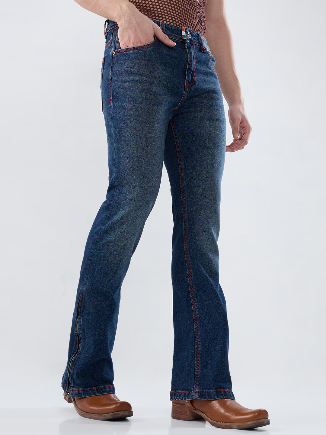 Men’s Bootcut Vintage Blue Stretch Jeans with Red Thread Detail & Bottom Zipper