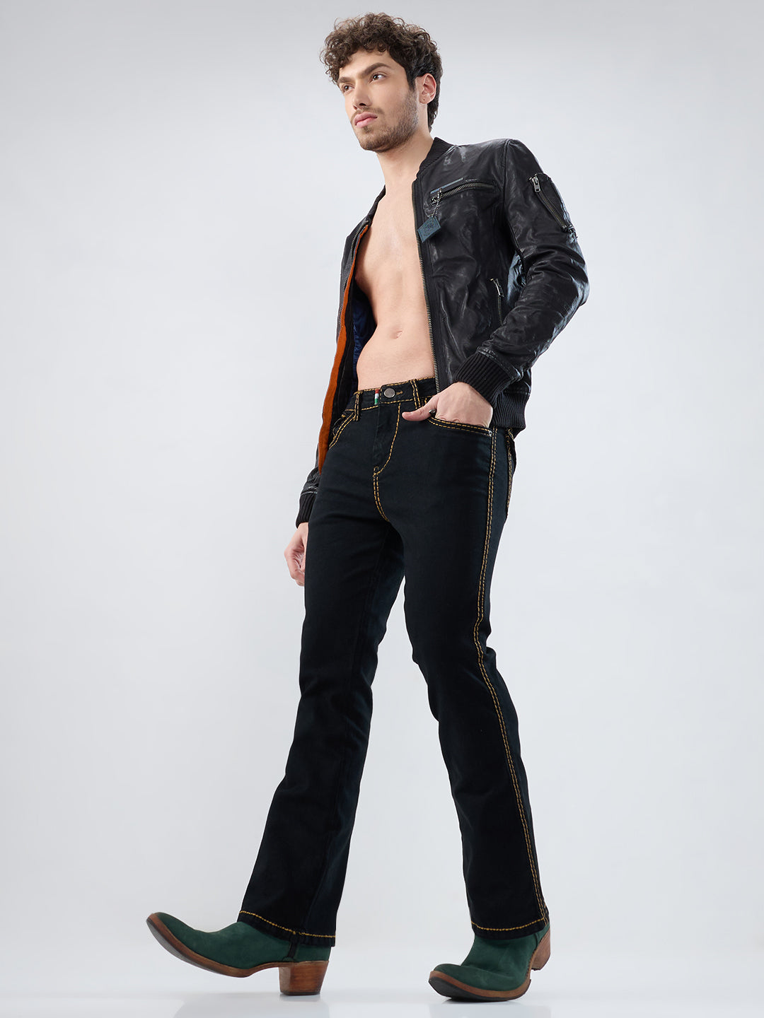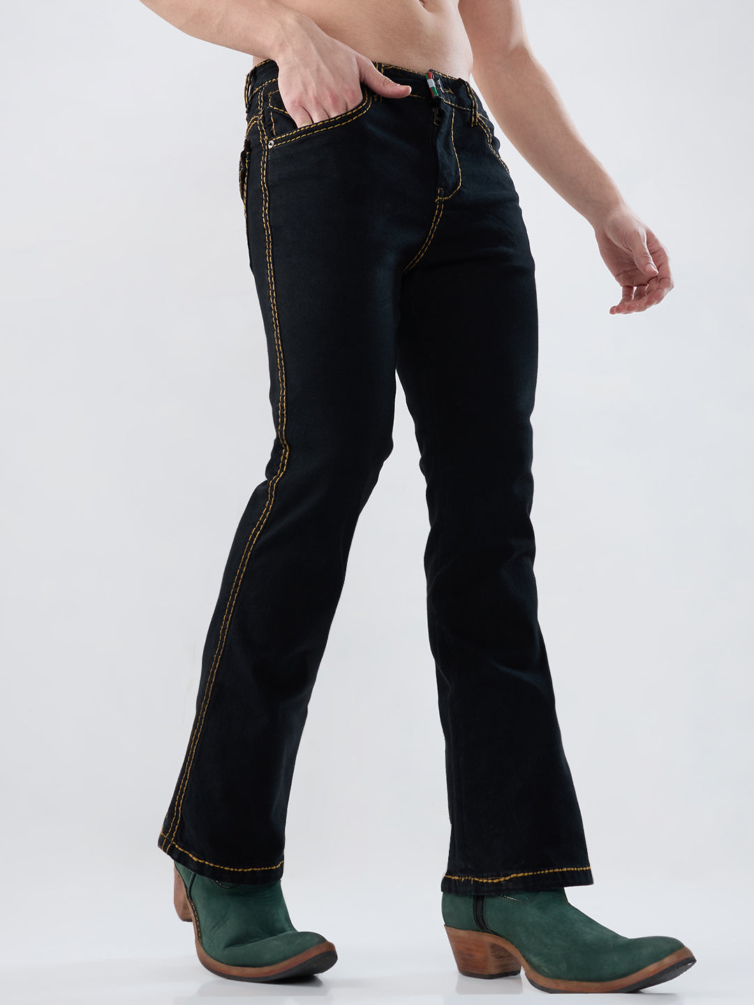 Men’s Jet Black Bootcut Stretch Denim Jeans – Mustard Stitching & Flap Pocket Accents
