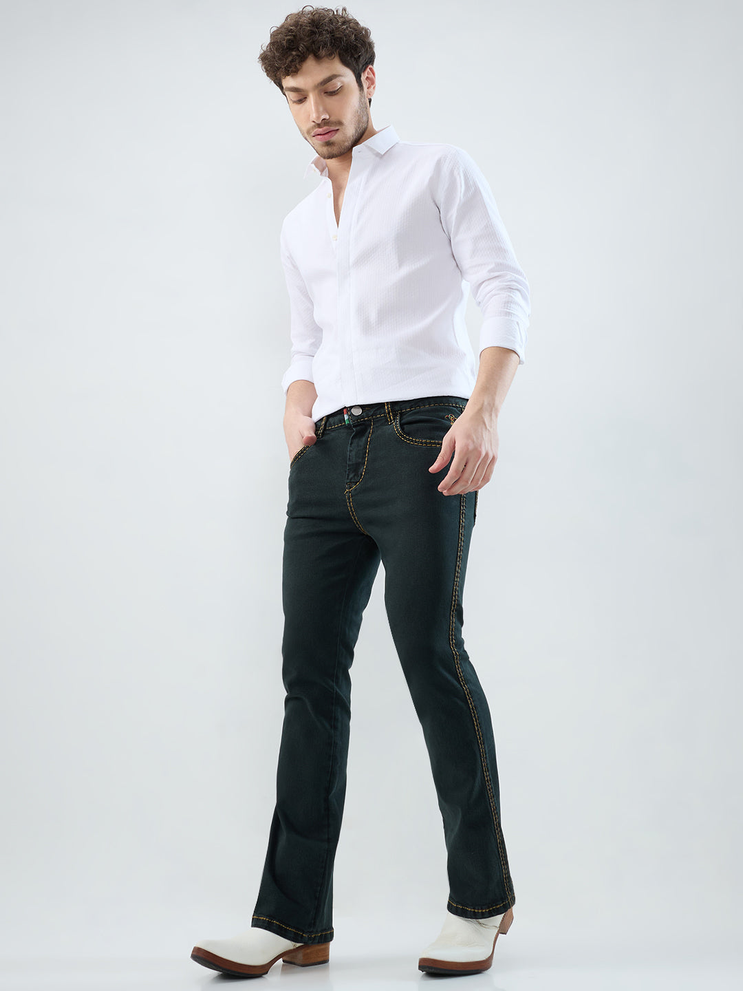 Men’s Shadow Olive Bootcut Denim Jeans with Mustard Stitching & Back Pocket Flaps