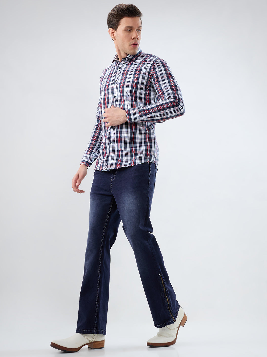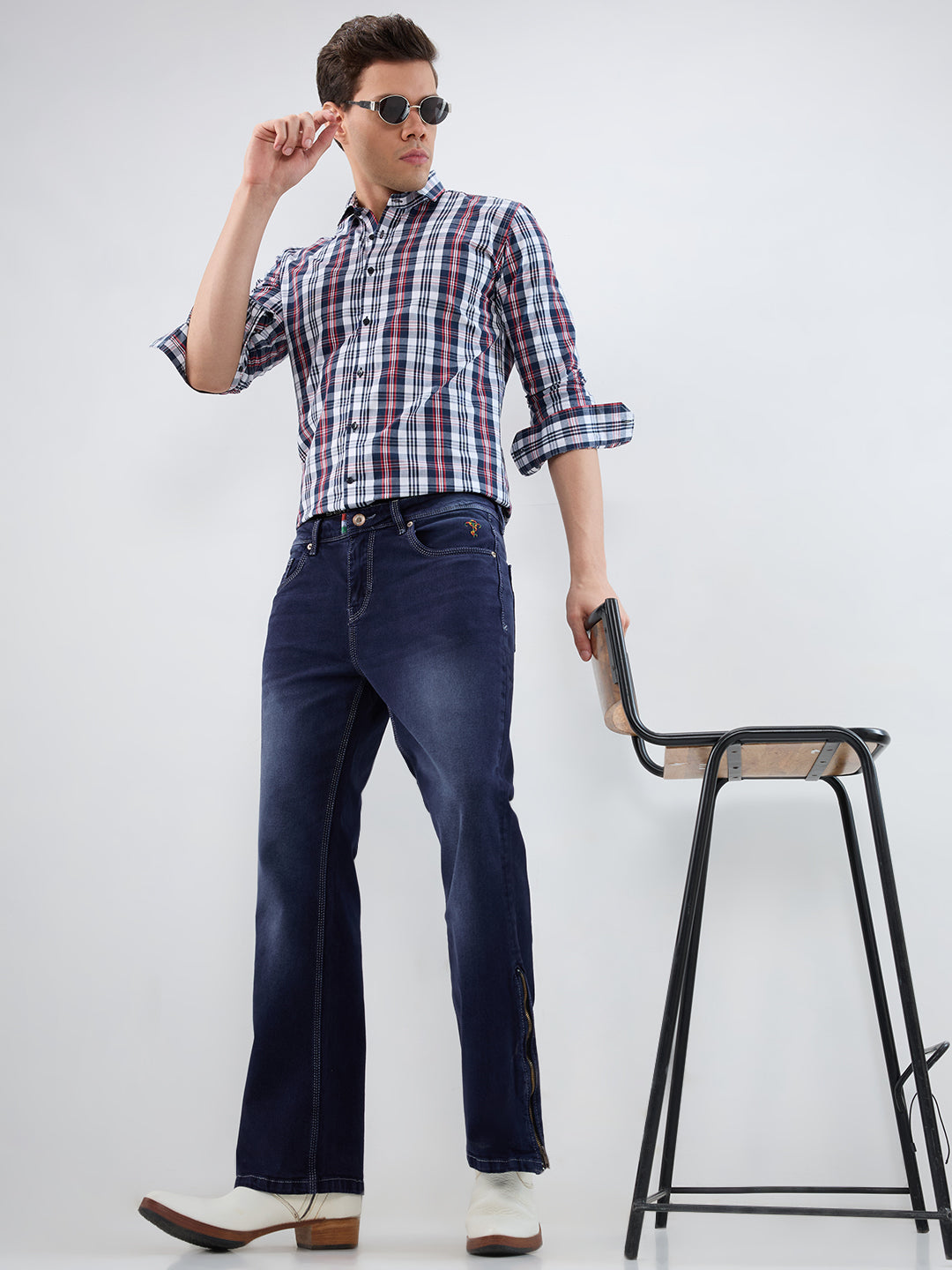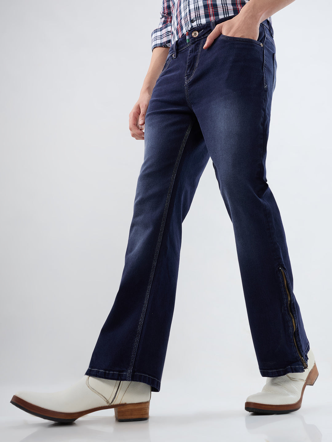 Midnight Indigo Bootcut Stretch Jeans with Bottom Zipper & Contrast Stitch Detailing for Men
